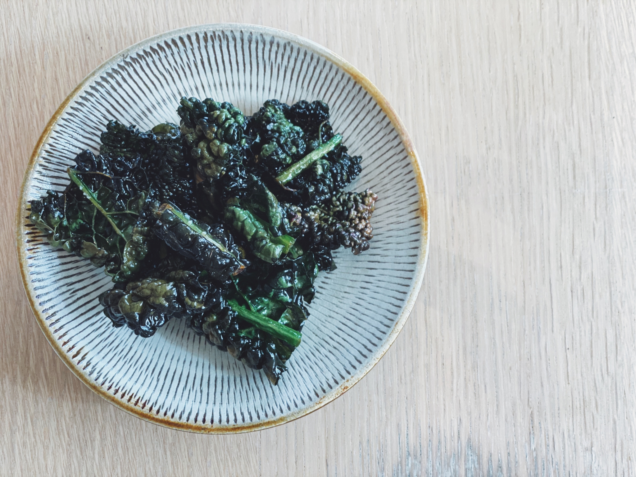 カーボロネロはイタリアのトスカーナ地方を原産とするアブラナ科、ケールと同じ仲間の野菜。別名、黒キャベツと呼ばれています。その名の通り黒がかったカーボロネロですが、油に入れると鮮やかな緑になり、それがとても美しい。