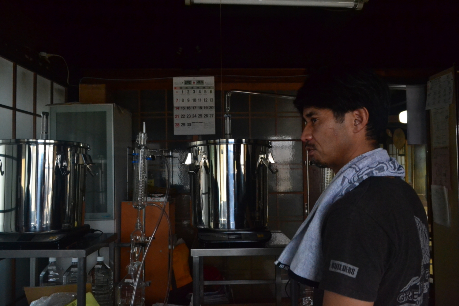 また、自宅にお邪魔すると、玄関先からラベンダーの良い香りがしてきます。正体はラベンダーの精油を蒸留している水蒸気蒸留器です。自宅の台所で蒸留している精油は、釜に沢山の生ラベンダーを茎ごと入れ蒸します。熱した蒸気がラベンダーの中を通り、釜から出てきた蒸気がガラス管で冷やされ液化したラベンダーウォーターになります。するとラベンダーウォーターの上にほんの少しの精油が浮いてできます。とても希少なことがわかります。