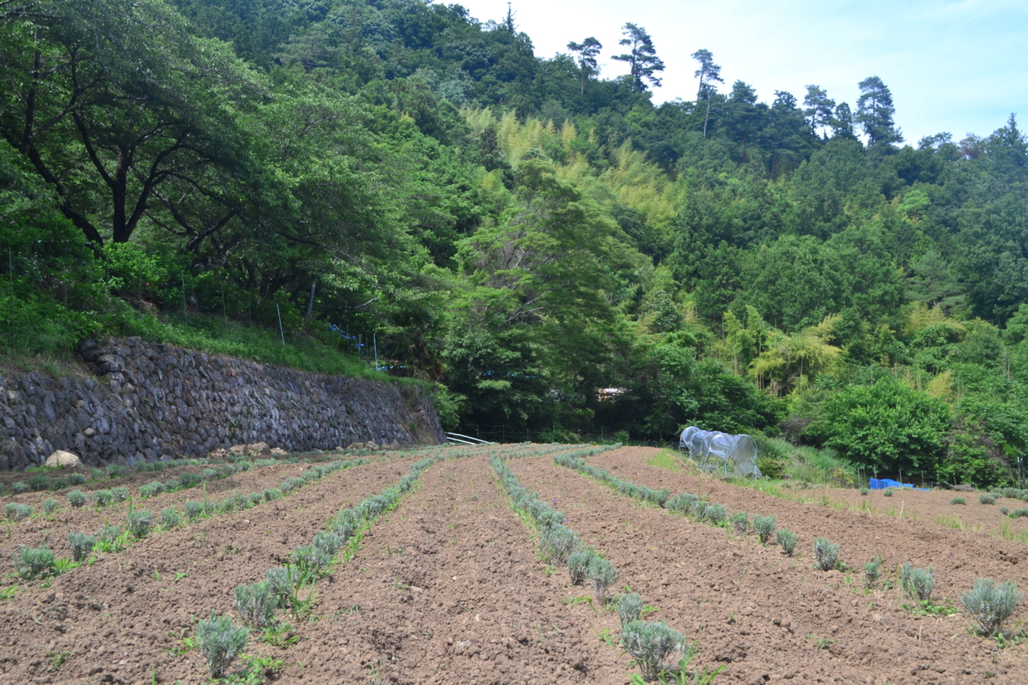 これまで何度も枯れてしまう失敗にあっており、数年前から排水工事をしています。土の中深くには、今では手入れがされなくなった竹藪の竹を自分で伐り、石とを籾殻を一緒に入れて、竹暗渠を施し、水はけの良い畑にしています。ラベンダーだけでなく、環境にも優しい。今は数年かけて土壌改良を行っている最中なので、人が訪れてもらえるようになるまでにはまだ大分先の事、との事。本来は雨の少ない良い土地で育つ高山植物であるため、山梨の高温多湿、棚田の土壌特性など、試行錯誤しながらの日々のようです。