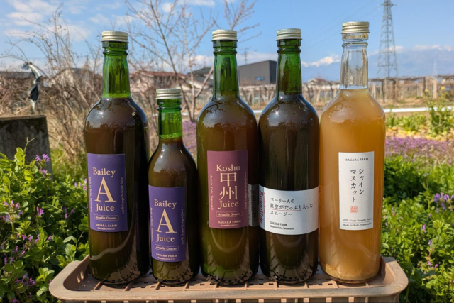 山梨県甲府市で、農薬や肥料を使わず、土も耕さず、自然のままにぶどうを育てる相良農園さん。畑の草や、そこに住まう虫や微生物と向き合う日々。今週の出店では、そんなぶどうを使ったワインとスムージー(ボトル)が並びます。