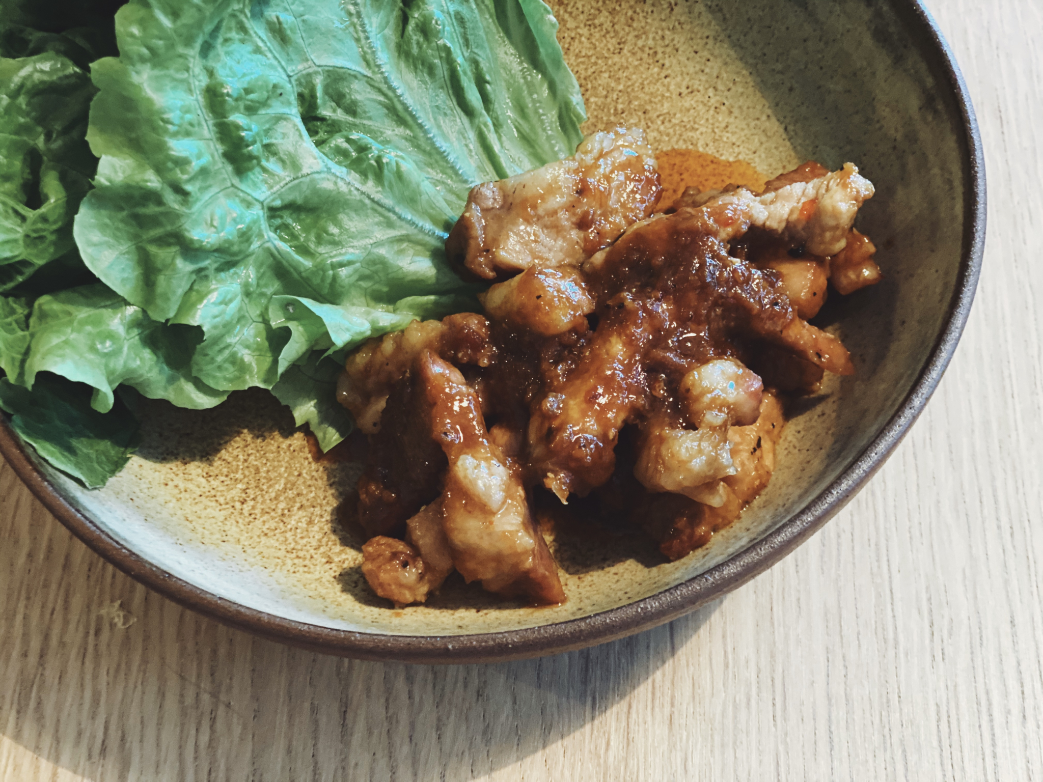 材料:豚ロース肉(とんかつ用が便利)300g、Omefarmの蜂蜜大さじ1、塩・胡椒少々、みそだれ(味噌大さじ1、酒大さじ1、醤油小さじ1、豆板醤小さじ1/2)、サニーレタス