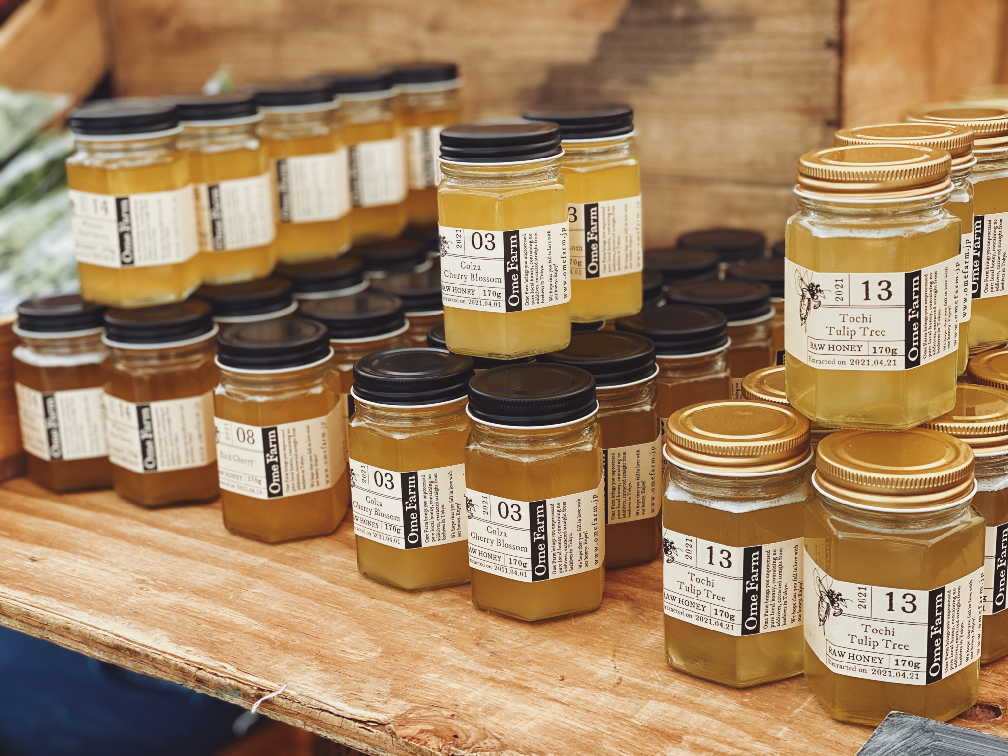 マーケットのOme Farmのブースには、写真のようにナンバリングされた沢山の種類の蜂蜜が毎週並びます。1年を通して約50もの種類がある蜂蜜には、瓶それぞれに桜、菜の花、野いちご、ラズベリー、アカシア、ユリノキ、和栗など青梅の山々や農場の野菜やハーブの色々な名前が書かれていますが、これは蜂が何を蜜源としたかを表しています。写真の「Cherry Blossom」のように単体のものもあれば「Tochi / Tulip Tree」のように複数の名前が書いてあるものもありますが、Ome Farmの養蜂担当者の方が蜂の動きを日々観察し、とれた蜂蜜をテイスティングで確かめ、この名前が決まるそうです。