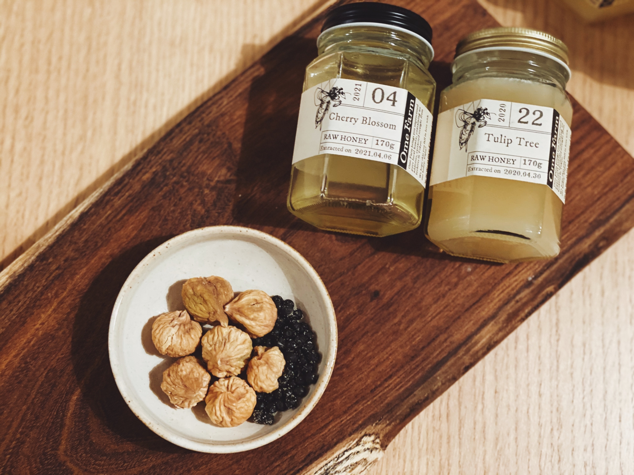 単刀直入に「Ome Farmの蜂蜜と合わせるならどれですか?」と店主のみきさんに尋ねたところ、真っ先に返ってきた答えは「おつまみ胡椒」と「白いちじく」。世界中のスパイスを扱う東京スパイスハウスさん。カンボジアの黒胡椒と岩塩を調合した塩味の効いたおつまみ胡椒は、もちろんそのままでもお酒のアテになりますが、おつまみ胡椒の後に蜂蜜をひとなめすると、永遠にそのループから抜け出せなくなります。間に白いちじくを入れて、トライアングルループで夜の晩酌時間を楽しんで頂きたい。