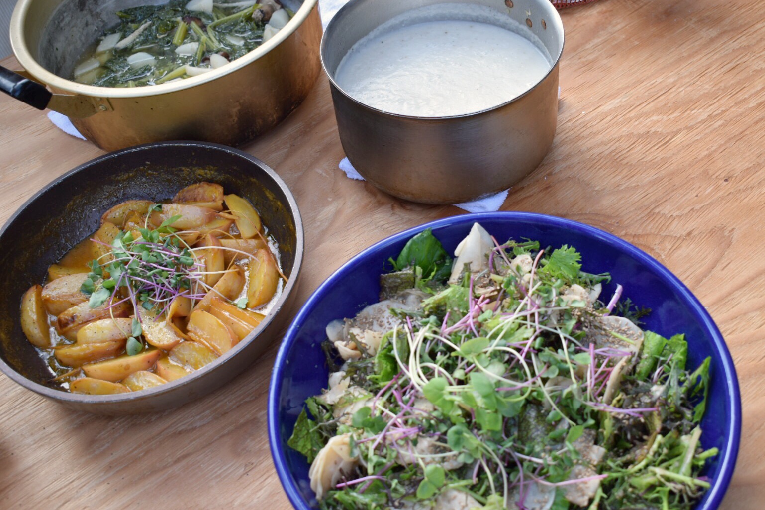 毎月旬の野菜を1つ選び、出店者さんやシェフにインスピレーションを受けたレシピをもとに4品の料理をみんなで作ります。