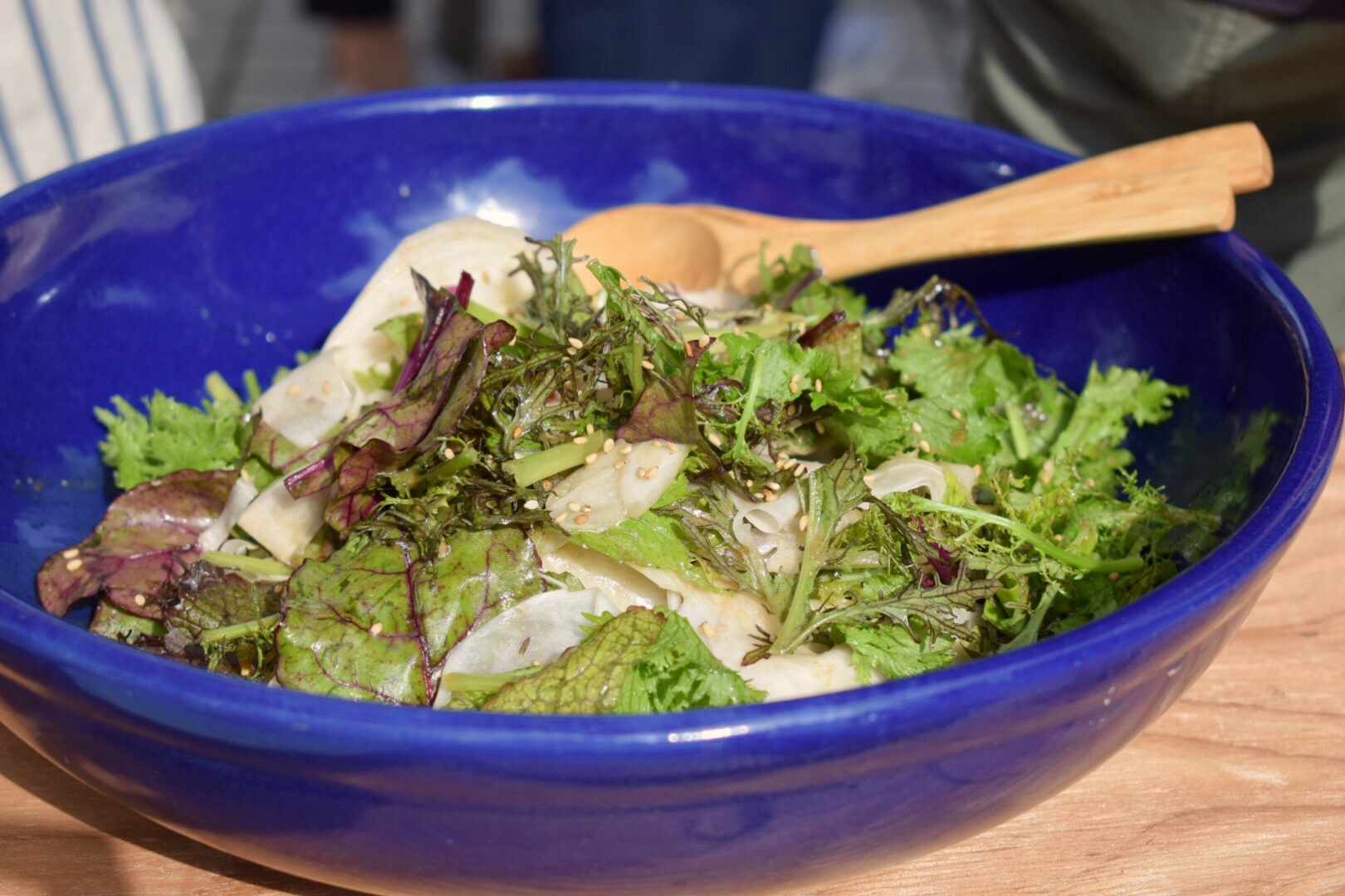 長細くて大根に似た見た目のかぶは辛味が強いのかと思いきや、生でも食べやすいやさしい味わいでした。スライスして、ざく切りにした葉野菜と一緒にドレッシングを絡めます。