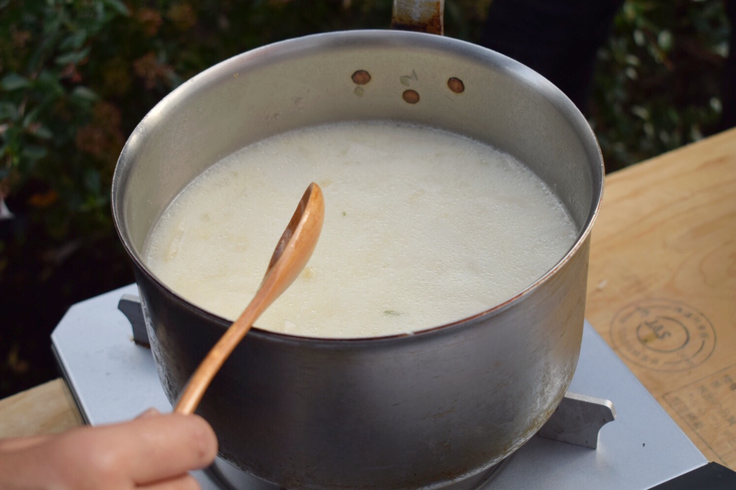新田さんによると、聖護院かぶは少し少し粗めなので煮物やスープ向きなんだとか。淡路島産の甘みの強い玉ねぎと豆乳を入れてブレンダーにかけ、味付けは塩胡椒のみ。素材の味を生かして、やさしくて美味しいポタージュが出来上がりました。