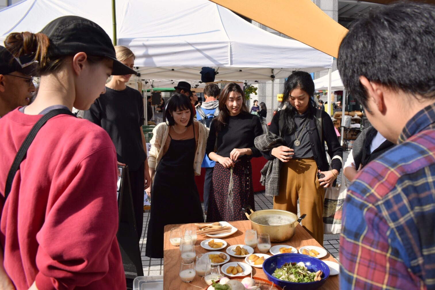 それぞれのグループが担当した料理の説明をしていると、その美味しそうな香りと見た目に足を止めるお客さんも。最後にはそんなお客さんたちとも一緒にテーブルを囲い、種類や調理法によって変わるかぶの味や食感を皆で楽しみました。